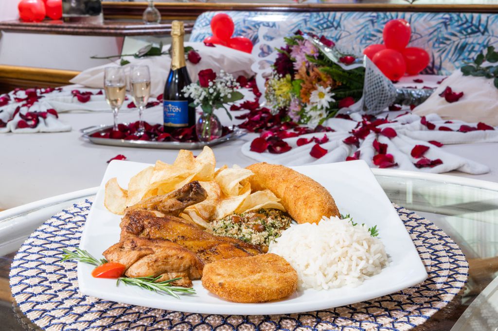 GRELHADO, BATATAS CORADAS, DOIS CAMARÕES, OVOS DE CODORNA, E ARROZ BRANCO