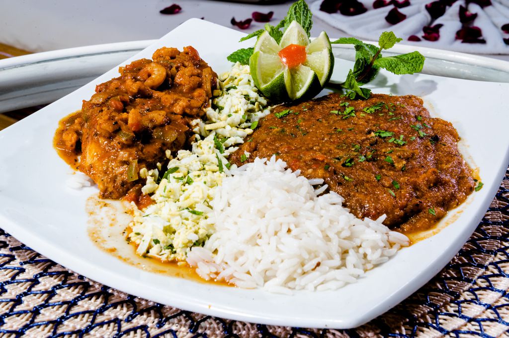 POSTA COZIDA, MOLHO DE CAMARÃO, PIRÃO, ARROZ BRANCO